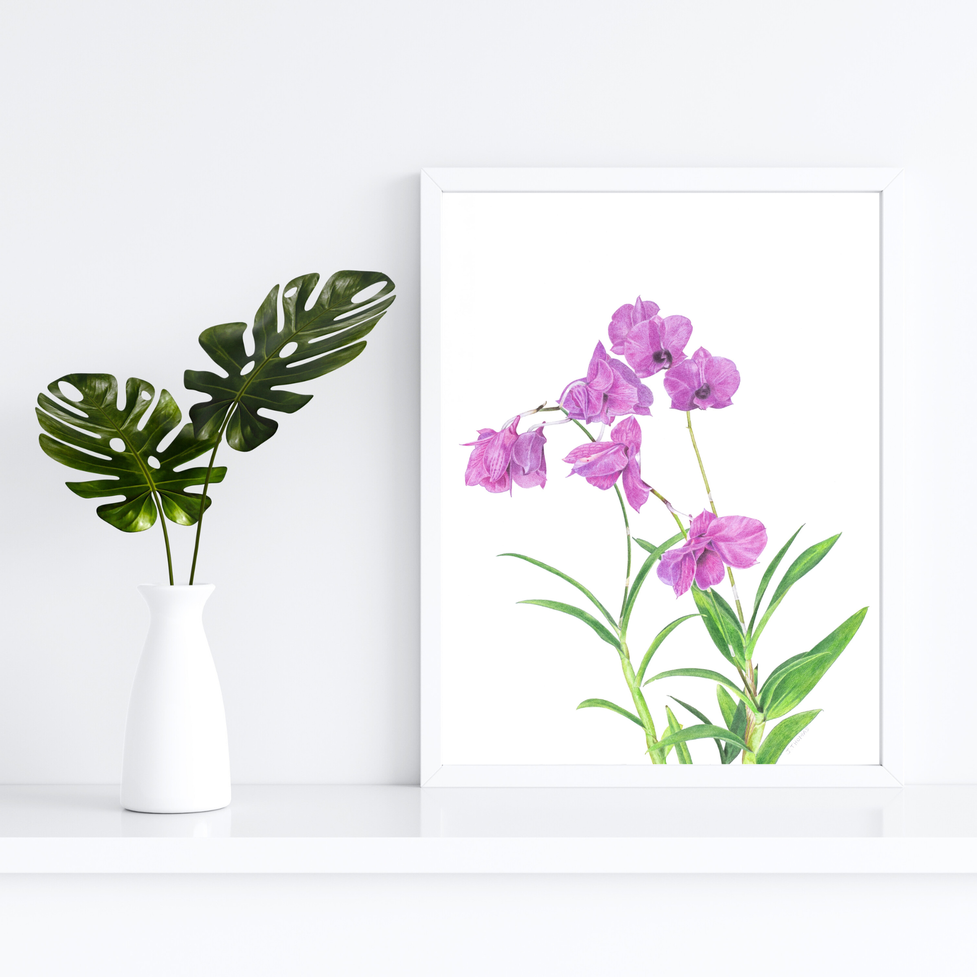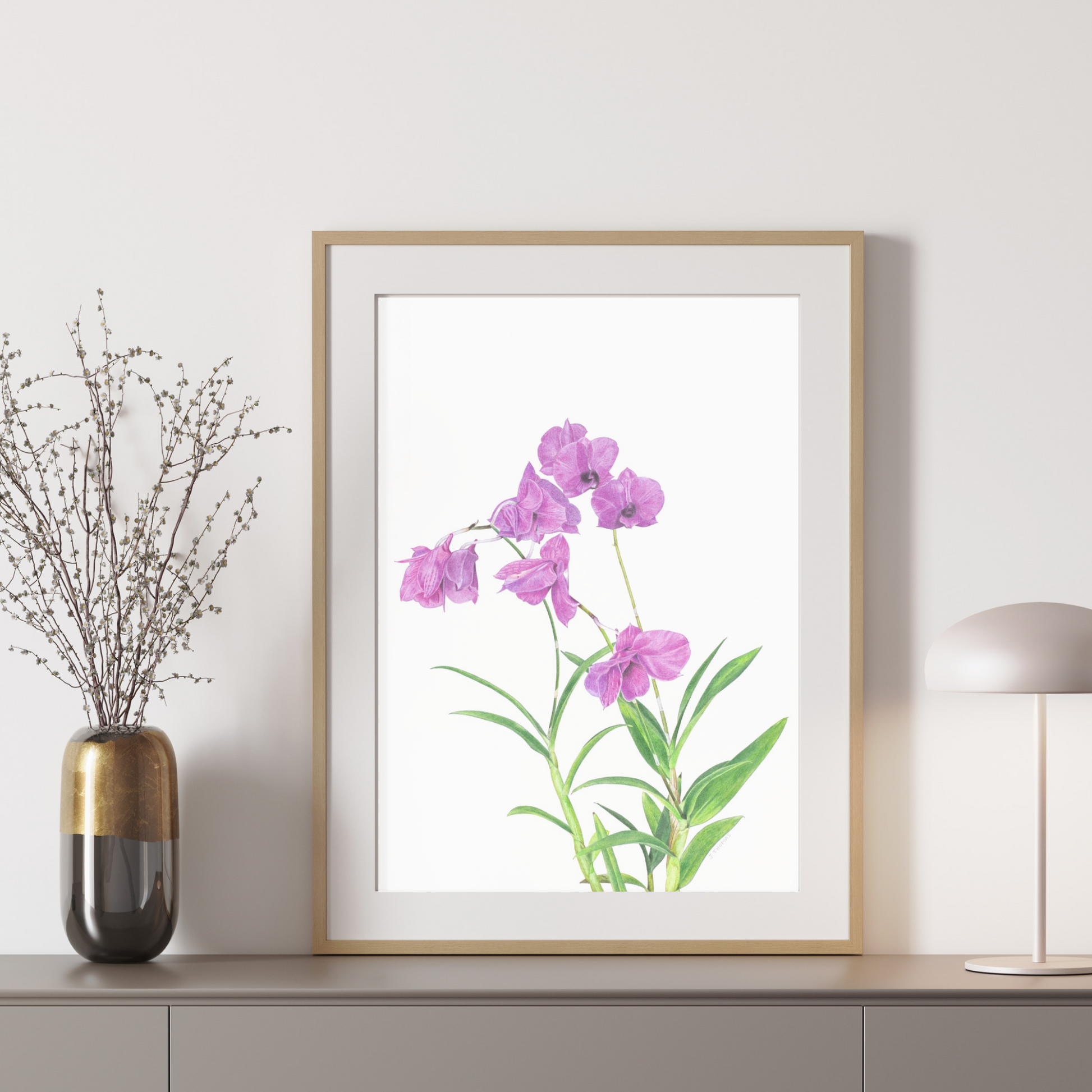 This exquisite colour pencil artwork captures the delicate beauty of the Cooktown Orchid, Queensland's floral emblem. The piece showcases the orchid's distinctive pinky-purple flower stems in stunning detail, each petal rendered with careful precision to highlight the bloom's elegant form. Rich, lush green leaves provide a vibrant contrast, grounding the composition and emphasizing the flower's graceful presence. Created with meticulous attention to botanical accuracy, this print celebrates the natural splendour of one of Australia's most beloved native orchids. A perfect addition for nature enthusiasts and lovers of Australian flora, bringing timeless botanical elegance to any space.